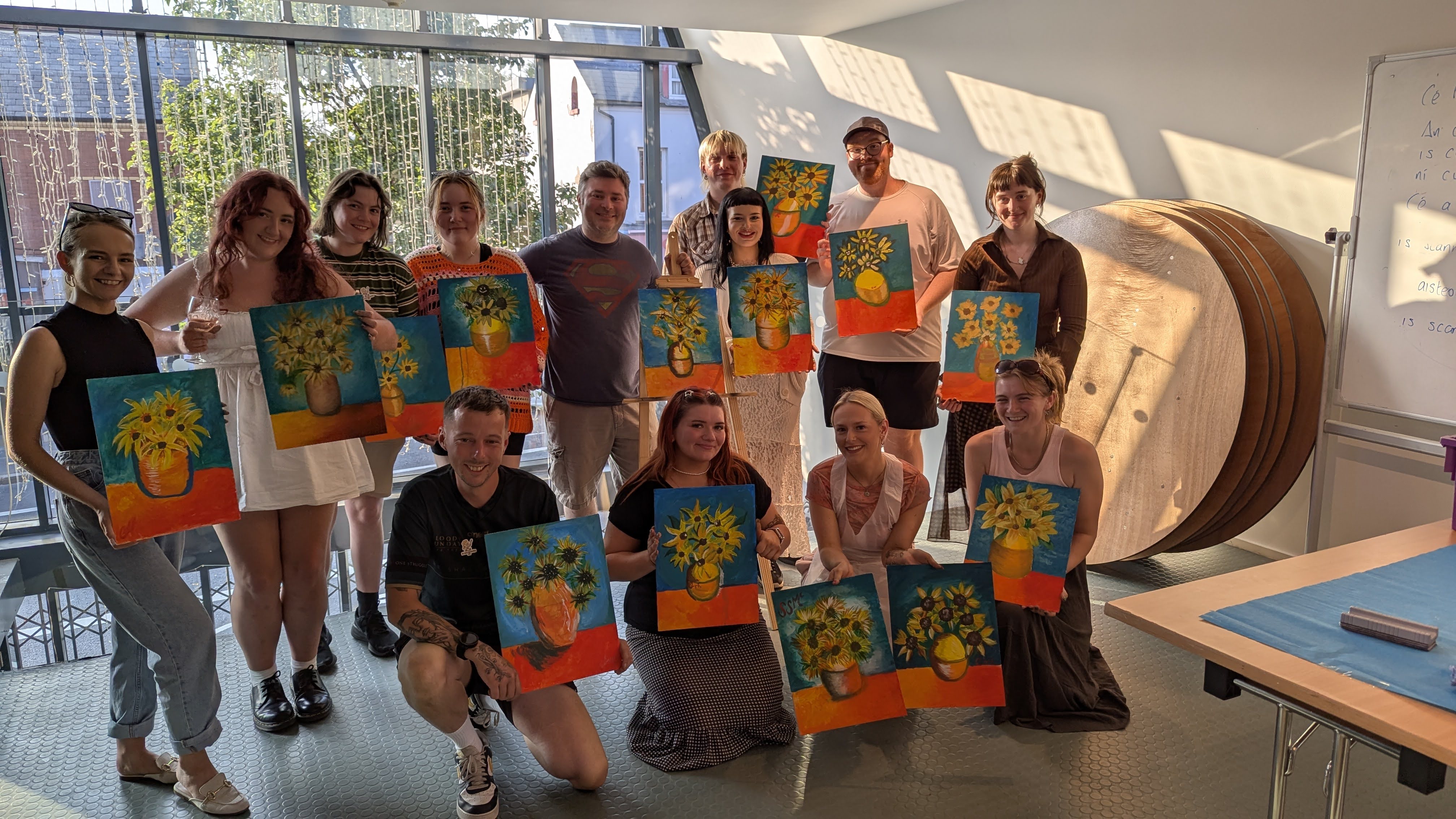 Beidh tú treoraithe céim ar chéim chun do shaothar féin a chruthú i dtimpeallacht chairdiúil, neamhfhoirmiúil, le ceol, gáire, agus cúpla focal caite isteach go nádúrtha agus tú ag péinteáil leat.
